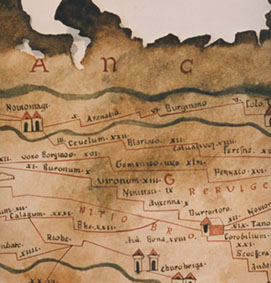 Fragment of a Roman road-map with in the upper-left corner Noviomagi (Nijmegen) and Ceuclum (Cuijk). Plan your route using the Omnes Viae Roman Routeplanner (a reconstruction of the above antique Roman map with internet technology).